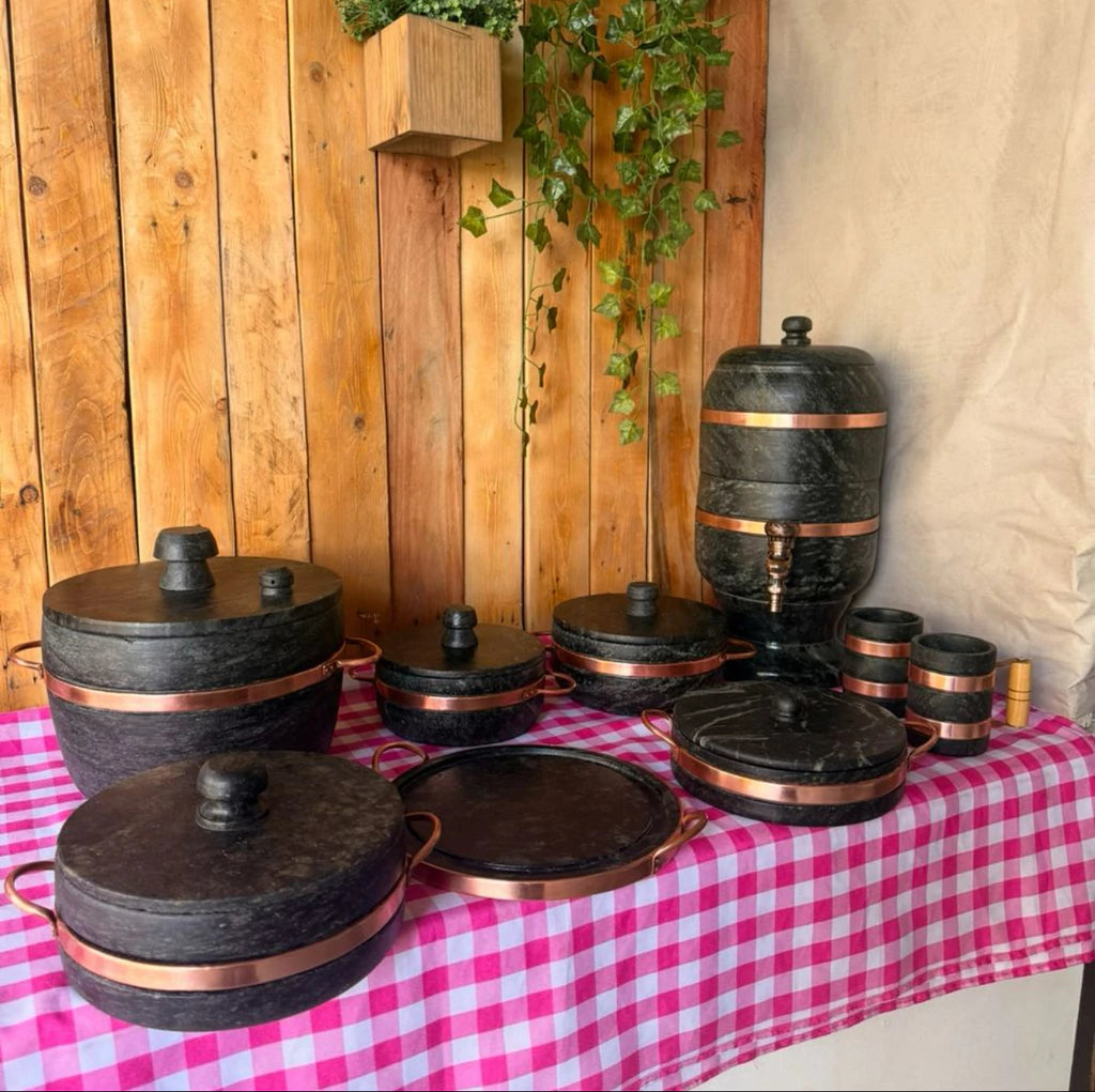 - Material: Pedra sabão e cobre (alças).